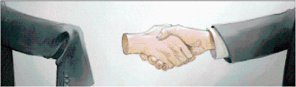 Handschlag mit Lösungsmöglichkeit. [Illustration: Vinzenz Schüller]
