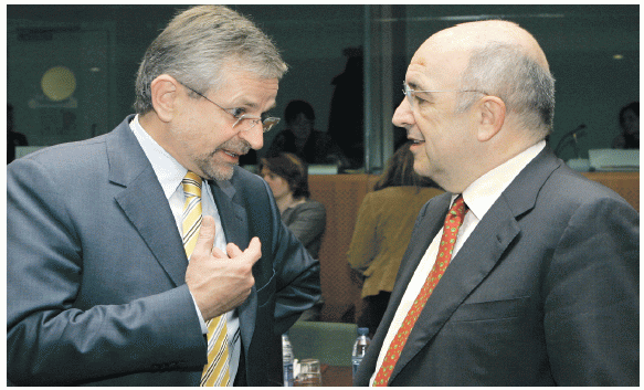 Damals in Brüssel. Finanzminister Molterer im Gespräch mit EU-Währungskommissar Joaquin Almunia während des Treffens der EU-Finanzminister am 4. Dezember 2007. Dort wurde die Abschaffung der Gesellschaftssteuer verhindert. [AP/Virginia Mayo]