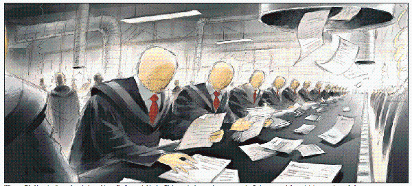 Wie am Fließband müsse sie arbeiten, klagt die österreichische Richterschaft – auch wenn manche Dokumente nicht so leicht zu ordnen sind. [Illustration: Vinzenz Schüller]