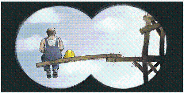 Ein Arbeitgeber muss Weitblick beweisen – und mit dem Fernrohr überwachen, ob seine Bauarbeiter die Sicherheitsbestimmungen einhalten. [Illustration: Vinzenz Schüller]