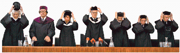 VfGH-Mitglieder entscheiden im Nachhinein. Im Bild (v. l.): Lisbeth Lass, Karl Spielbüchler, Vizepräsidentin Brigitte Bierlein, Präsident Gerhart Holzinger, Kurt Heller, Willibald Liehr, Hans Georg Ruppe. [AP/Punz]