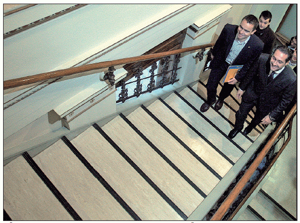 FPÖ-Bundesparteiobmann Heinz-Christian Strache (r.) und der Kärntner BZÖ-Obmann Uwe Scheuch auf dem Weg zur Pressekonferenz, bei der sie ihre Zusammenarbeit nach dem CDU/CSU-Modell bekannt gaben. [APA/Georg Hochmuth]