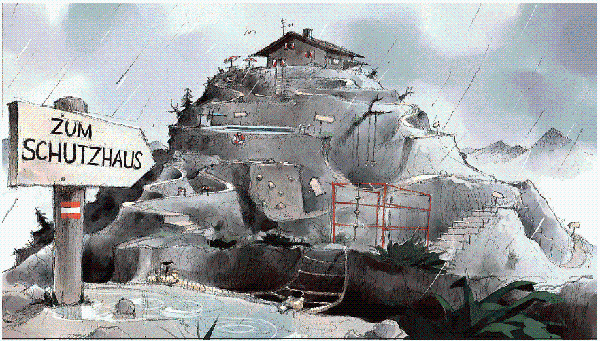 Schwieriger Aufstieg zum Asyl. [Illustration: Vinzenz Schüller]