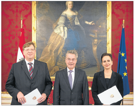 Präsidenten unter sich: VwGH-Vizepräsidentin Anna Sporrer und Präsident Rudolf Thienel nach der Angelobung durch Bundespräsident Heinz Fischer in der Hofburg. [APA/Bundesheer/Peter Lechner]