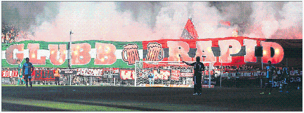 Beim Testspiel Rapid – Nürnberg (1:3) im September 2013 ging es auf den Tribünen noch friedlich zu; nach dem Abpfiff attackierten die vereinten Fans die Polizei. [Gepa/Philipp Brem]