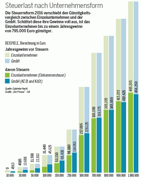 St. Pölten. Die zu Jahresbeginn 2016 in Kraft tretende Steuerreform mischt die Karten im Günstigkeitsvergleich zwischen GmbH und Einzelunternehmen neu. Das ergibt sich vor allem aus der Senkung des Einkommensteuertarifs, aber auch aus der Erhöhung der Kapitalertragsteuer von 25 auf 27,5 Prozent. "Aus steuerlicher Sicht nimmt die Attraktivität der GmbH im Vergleich zu einem Einzelunternehmen deutlich ab", sagte Gabriele Hackl, Steuerberaterin und Wirtschaftsprüferin, vorige Woche in St. Pölten beim großen Herbstseminar der Akademie der Wirtschaftstreuhänder.