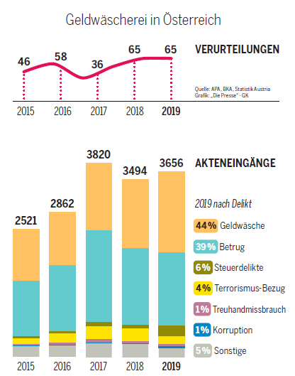 Innsbruck. Für das Jahr 2019 weist die gerichtliche Kriminalstatistik 65 Verurteilungen wegen Geldwäscherei auf, genau gleich viele wie für 2018 und immerhin zehn mehr als 2017. Das ist nicht nichts, und verglichen mit vielen Delikten, die in der Statistik so gut wie gar nicht vorkommen, ist das sogar eine ganz stattliche Summe. Bedenkt man allerdings, wie oft der Tatbestand in den vergangenen Jahren ausgebaut wurde und welch weite Teile der Wirtschaft – Banken, Handelsgewerbetreibende, Rechtsanwälte, Wirtschaftstreuhänder und noch viele mehr – auf eigene Kosten (und eigenes Risiko) durch Sorgfalts-, Melde- und ähnliche Pflichten polizeiliche Vorfeldarbeit leisten müssen, erscheinen 65 Verurteilungen als magere Ausbeute.