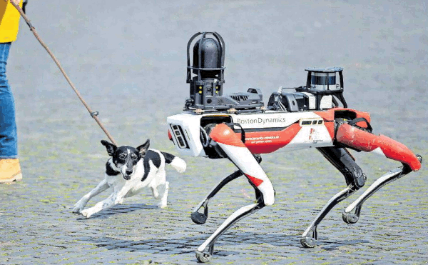 Ein Roboter des Sicherheitsdienstleisters Ciborius mit hundeähnlichen Bewegungen, künstlicher Intelligenz und 360-Grad-Kamera.