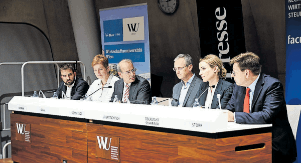An der WU diskutierten (v. l. n. r.): Josef Thoman, Sigrid Stagl, „Presse“- Moderator Benedikt Kommenda, Wolfgang Urbantschitsch, Judith Obermayr-Schreiber und Stefan Storr.