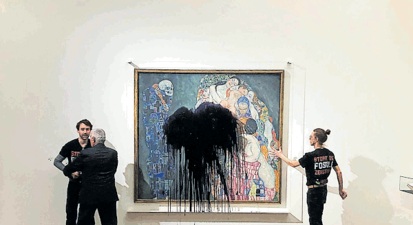 Im Leopold Museum in Wien wurde ein Klimt-Gemälde überschüttet, ein Aktivist klebte sich selbst an den Rahmen.