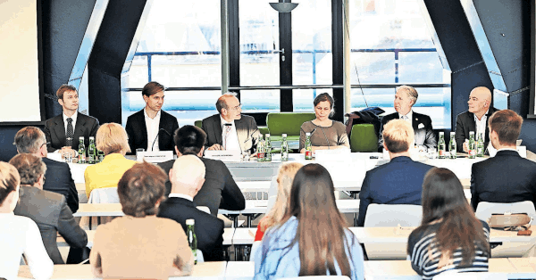 Das Thema künstliche Intelligenz stieß im Dachgeschoß des Wiener Juridicums auf großes (menschliches) Interesse. Am Podium diskutierten dabei (v. li. n. re.): Matthias Schmidl, Dominique Schichtle, „Presse“-Moderator Benedikt Kommenda, Iris Eisenberger, Wolfgang Zankl und Harald Leitenmüller.