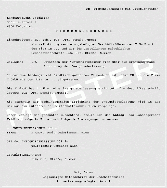 Bei allen Rechtsträgern sind einzutragen: Zweigniederlassungen mit ihrem Ort, der für Zustellungen maßgeblichen Geschäftsanschrift und ihrer Firma, wenn sie von der Firma der Hauptniederlassung abweicht (§ 3 Abs 1 Z 6 FBG). Wörtlich interpretiert wäre die Firma der Zweigniederlassung nur dann ins Firmenbuch einzutragen, wenn sie von der Hauptniederlassung abweicht. In der Praxis wird die Firma der Zweigniederlassung aber auch dann in das Firmenbuch eingetragen, wenn sie von der Hauptniederlassung nicht abweicht. Das ADV-Programm sieht ein zwingend zu befüllendes Datenfeld für die Firma der Zweigniederlassung vor.
