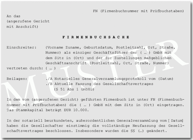 Wird eine beschlossene vollständige Neufassung des Gesellschaftsvertrages einer GmbH zur Eintragung ins Firmenbuch angemeldet, stellt sich die Frage, ob das Gericht nur die tatsächlich geänderten Bestimmungen oder auch die unverändert gebliebenen Bestimmungen (neuerlich) auf ihre materielle Richtigkeit zu prüfen hat.