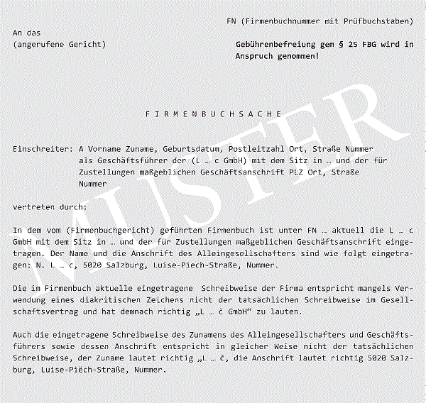 Seit Kurzem ist es technisch möglich, diakritische Zeichen im Firmenbuch darzustellen. Mit der Gerichtsgebühren-Novelle 2015 (GGN 2015), BGBl I 2015/156 wurde in § 25 FBG für diesbezügliche Berichtigungen, und Anträgen auf Änderung der Firma, welche ausschließlich die Aufnahme diakritischer Zeichen zum Gegenstand haben, befristete Gebührenbefreiungen normiert.
