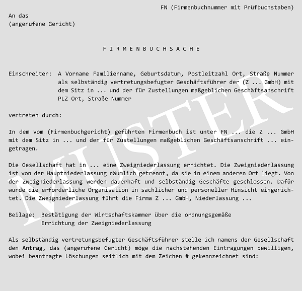 Für Zweigniederlassungen inländischer Rechtsträger gibt es seit dem FBG unternehmensrechtlich nur mehr einen Eintragungstatbestand (§ 3 Abs 1 Z 6 FBG) und eine Zuständigkeitsvorschrift (§ 120 Abs 2 JN). In der Praxis werden in Einzelfällen noch gesonderte Namenszeichnungserklärungen für die Zweigniederlassung vorgelegt, welche aber seit der Aufhebung des § 13 Abs 2 HGB nicht mit erforderlich sind.