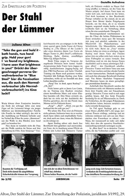 Populärkulturelle Erzeugnisse zu im weitesten Sinne „rechtlichen“ Themen sind im juridikum praktisch seit Beginn präsent, die Geschlechterverhältnisse ohnehin. Ein Text von Juliane Alton, beziehungsreich übertitelt mit „Der Stahl der Lämmer“,1 setzte sich bereits 1992 mit der Darstellung der Polizistin auseinander, anhand zweier Blockbuster, die heute als Klassiker gelten: „Das Schweigen der Lämmer“ (1991) mit Jodie Foster als Special Agent Clarice Starling, und „Blue Steel“ (1990) mit Jamie Lee Curtis als Detective Megan Turner. Die beiden Detective-Figuren traten damals gewissermaßen in die Kino-Fußstapfen von zwei Serienheldinnen, die fast während der gesamten 1980er Jahre das Bild weiblicher Polizistinnen prägten: Cagney & Lacey. Die TV-Serie wurde auch im österreichischen Fernsehen gezeigt und sorgte dafür, dass unser jeweiliges Bild von Polizist*innen nicht rein männlich war, wie dies umgekehrt etwa in der Serie „Die Straßen von San Francisco“ nahegelegt wurde. Altons Text im juridikum endet mit der Hoffnung, dass die besprochenen Filme als Eisbrecher dienen können, indem sie „Sphären für handelnde Frauen“ eröffnen, nicht nur als gute, sondern auch als „unanständige oder korrupte Polizistin“.2 Damit bringt sie den Bedarf nach vielfältigen, komplexen Darstellungen zum Ausdruck, in denen Frauen ihren Erfolg nicht um den Preis der Tugendhaftigkeit erkaufen müssen, in denen sie aber auch nicht als eiskalte, herzlose Monster herhalten, deren Karriere auf Kosten ihrer sogenannten „Weiblichkeit“ geht.