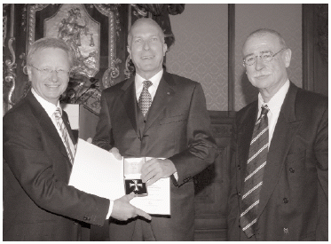 Ehrenkreuzverleihung an Prof. Franz-Leo Popp (Mitte). Es gratulieren Staatssekretär Franz Morak und der Laudator, Dr. Michael Scharang.