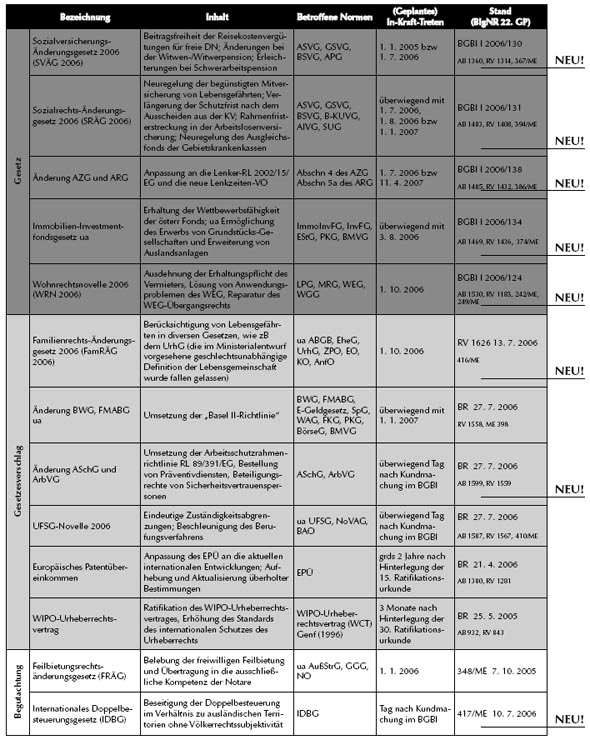 Übersicht über den Stand wichtiger aktueller Gesetzesvorhaben (Stand: 7. 8. 2006)