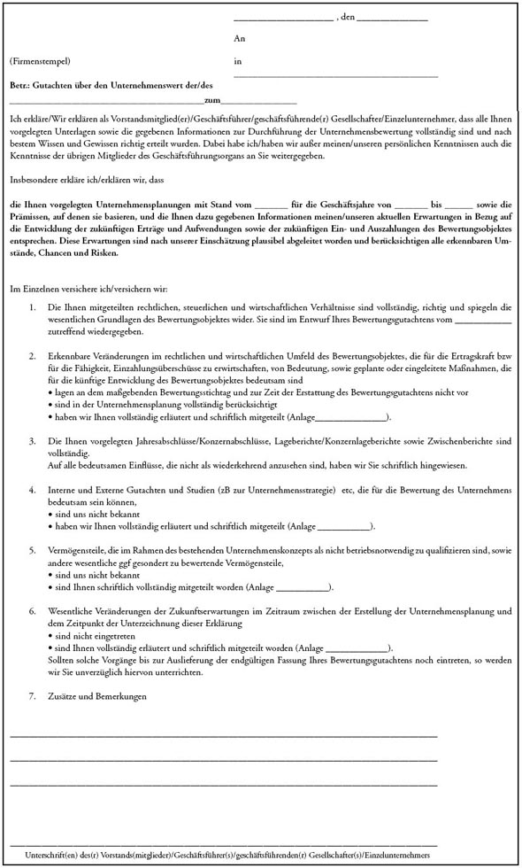 Ein einheitliches Vorgehen bei der Formulierung einer Vollständigkeitserklärung für Unternehmensbewertungen war bis dato in Österreich nicht gegeben. Der Fachsenat der Kammer der WT hat sich daher im Rahmen der Herausgabe des neuen Fachgutachtens für Unternehmensbewertungen in einem Arbeitsausschuss auch erstmals mit der Formulierung einer Vollständigkeitserklärung bei Unternehmensbewertungen befasst.